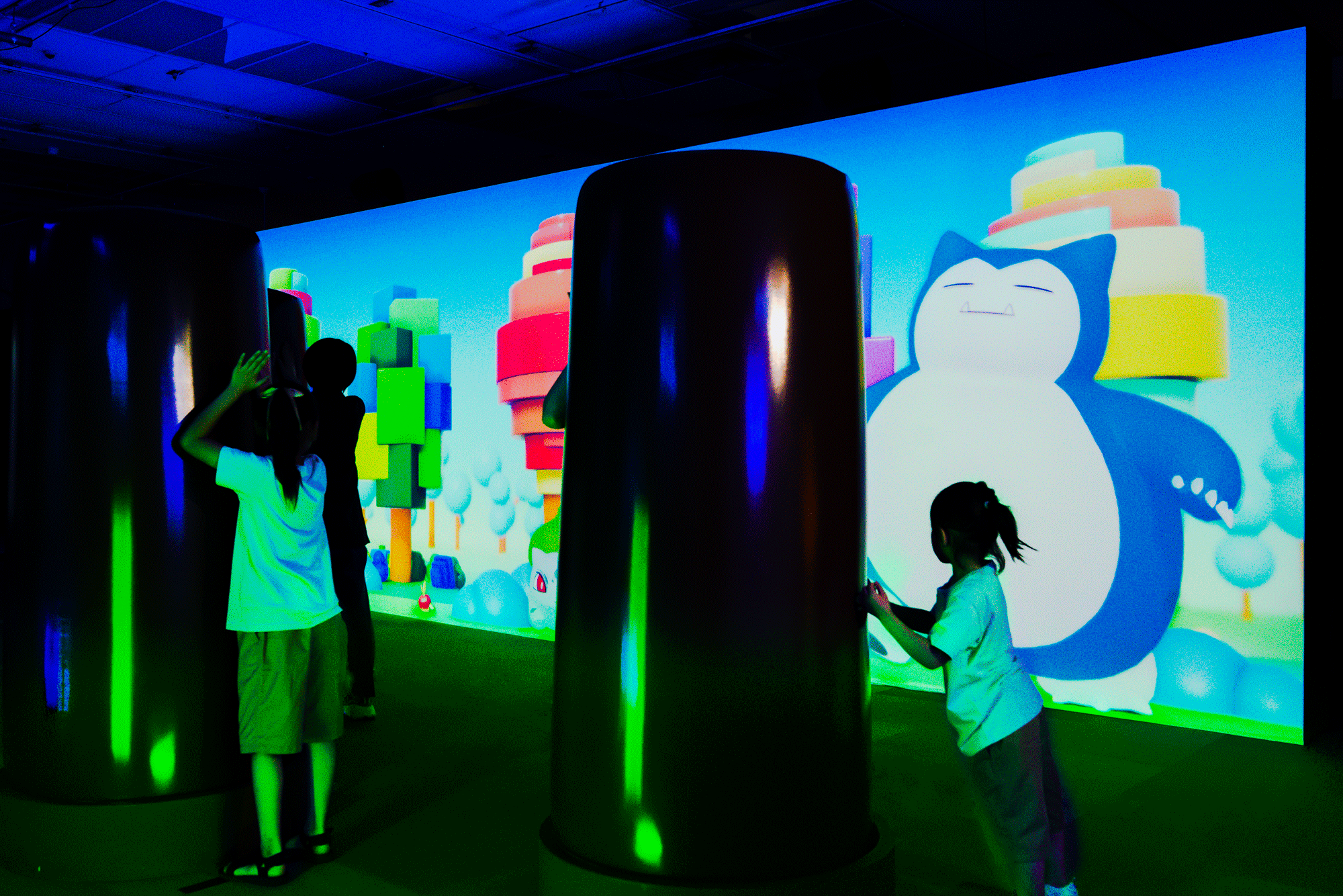 それぞれのコンテンツでは、来場者が身体を動かすことによってプロジェクションや映像が変化。体験を通して画面内にポケモンが現れ、目の前の世界にカラフルな色があふれていきます。