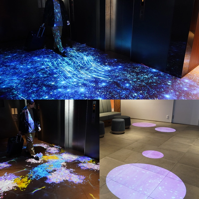 ホテル空間DX(デジタル・トランスフォーメーション)の推進に向けて、東急リゾーツ&ステイ株式会社と協業し、最新のデジタルコンテンツを開発・導入しました。プロジェクションマッピングにより、最上階エレベーターホールは宿泊者の動きで映像が変化する没入型空間(昼は水面、夜は星空)に、また1階エントランスでは小型プロジェクターが宿泊者をエレベーターへ自然に誘導し、今後は日本の四季に応じた映像演出で快適な移動と幻想的な体験を提供します。