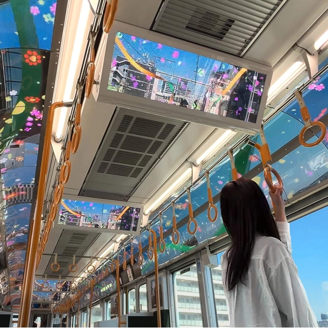 様々なことがWebで完結できてしまう時代、万博アクセスルート付加価値創出を機に、鉄道を移動手段だけでなく、電車に乗って外に出てリアル世界を体験する楽しさを感じていただくことを目的とした車内空間演出。大阪の街を運行する鉄道車両に於いて、車窓から撮影されたライブ映像と、GPS検知した位置情報と同期したAR演出を、鉄道車内空間にデジタル映像として上映することにより、オープンカーのような解放感と大阪の街を舞台としたパレードを走行していると感じられる鉄道車両になります。