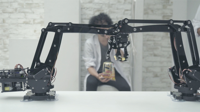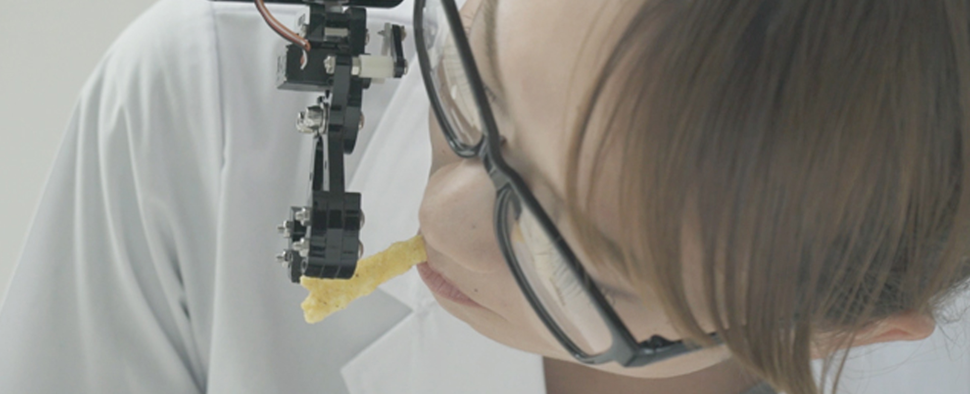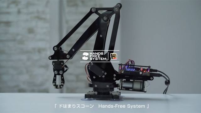 ですが、製品開発段階から、指に付いた粉がパソコンやスマートフォンなどの操作の妨げとなり、食べたいけど食べられない問題が想定されていました。この問題解決を図るため、「湖池屋 指の粉対策プロジェクト」を発足。近年の、スナック菓子用の箸やトングといったガジェットが開発・発売されている時流を受け、ロボットアームやドローンを活用し、指に粉を付けることなく「ドはまりスコーン」を口に運ぶことのできる、「ドはまりスコーン Hands-Free System」を開発しました。