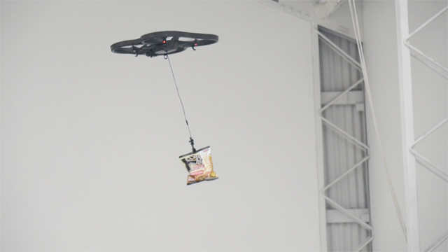そこで、湖池屋の叡智と技術を結集して作った最新ロボットシステムと銘打ち、「ドはまりスコーン Hands-Free System」を構築。ドローンとロボットアームを使用して、指に粉を付けることなく口に運ぶことのできる活気的なシステムです。