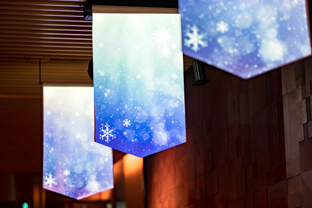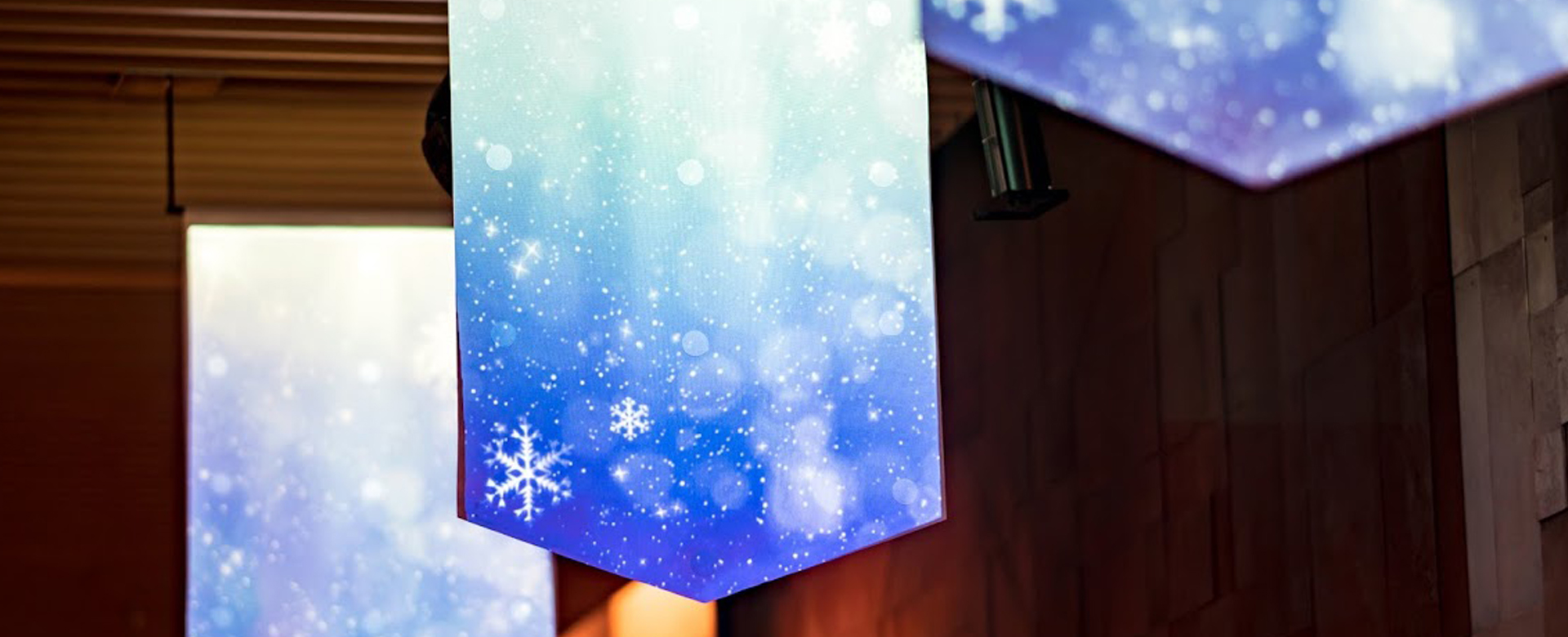 風の通る1階エントランスにて、「冬の縁日」・「冬の下の物語」をテーマに、昼夜で映像を入れ変え、定時イベント演出を織り交ぜた展示を行いました。風を受けて旗が揺れ、その動きを読み取り映像や音が変化することで、その場の空気感に合わせた空間演出を行いました。また、任意のタイミングで送風することで意図的に旗を揺らし映像に変化を与え、より動きのあるイベント表現を行いました。