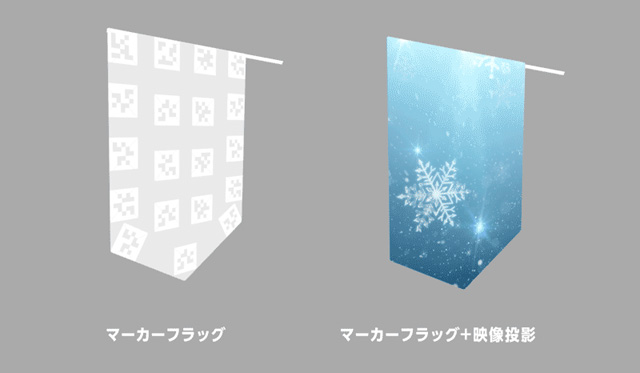 さらに、その変形情報を元に投影する映像素材もフラッグの形状に変形させる処理を行うことで、フラッグの揺れや歪みに合わせた「張り付いたような映像投影」を実現しています。