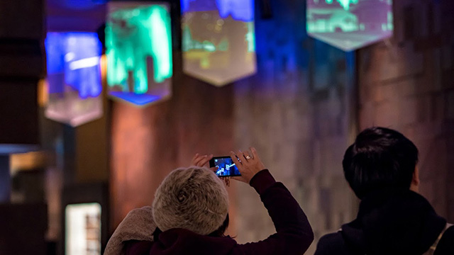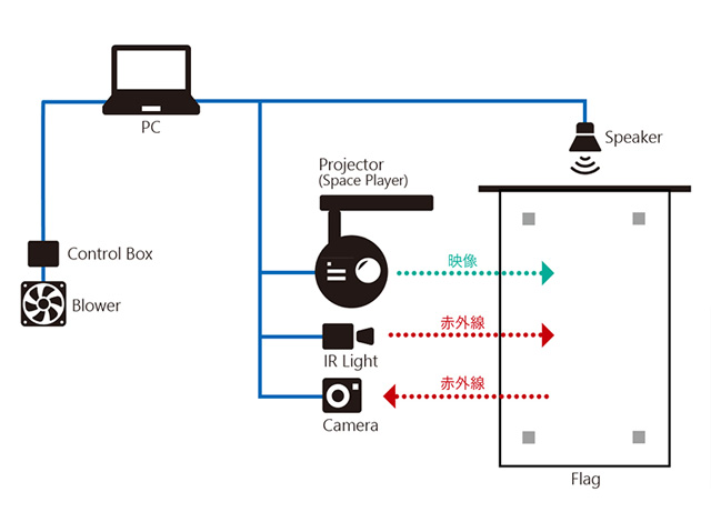 旗の揺れがトリガーになり変化する場の空気感に合わせた演出を楽しむ。