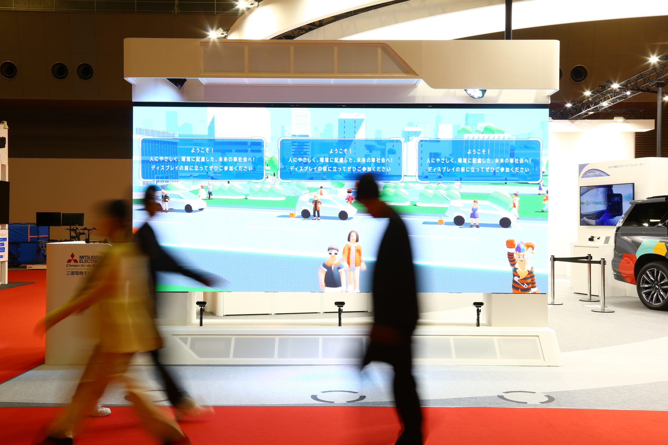 三菱電機モビリティが描く「少しだけ先の未来の街」をテーマに、各種3つのソリューションを擬似体験できるインタラクティブコンテンツを制作しました。ブース入口に設置されたメインステージLEDビジョンでは、体験者がビジョンの前に立つことで自身のアバターが画面上に登場。体験者の動きに連動したアバターが、ブース内の3つのゾーンで紹介されるソリューションをゲーム感覚で体験することで、三菱電機モビリティが目指す未来の暮らしを、楽しみながら理解できるコンテンツとしています。