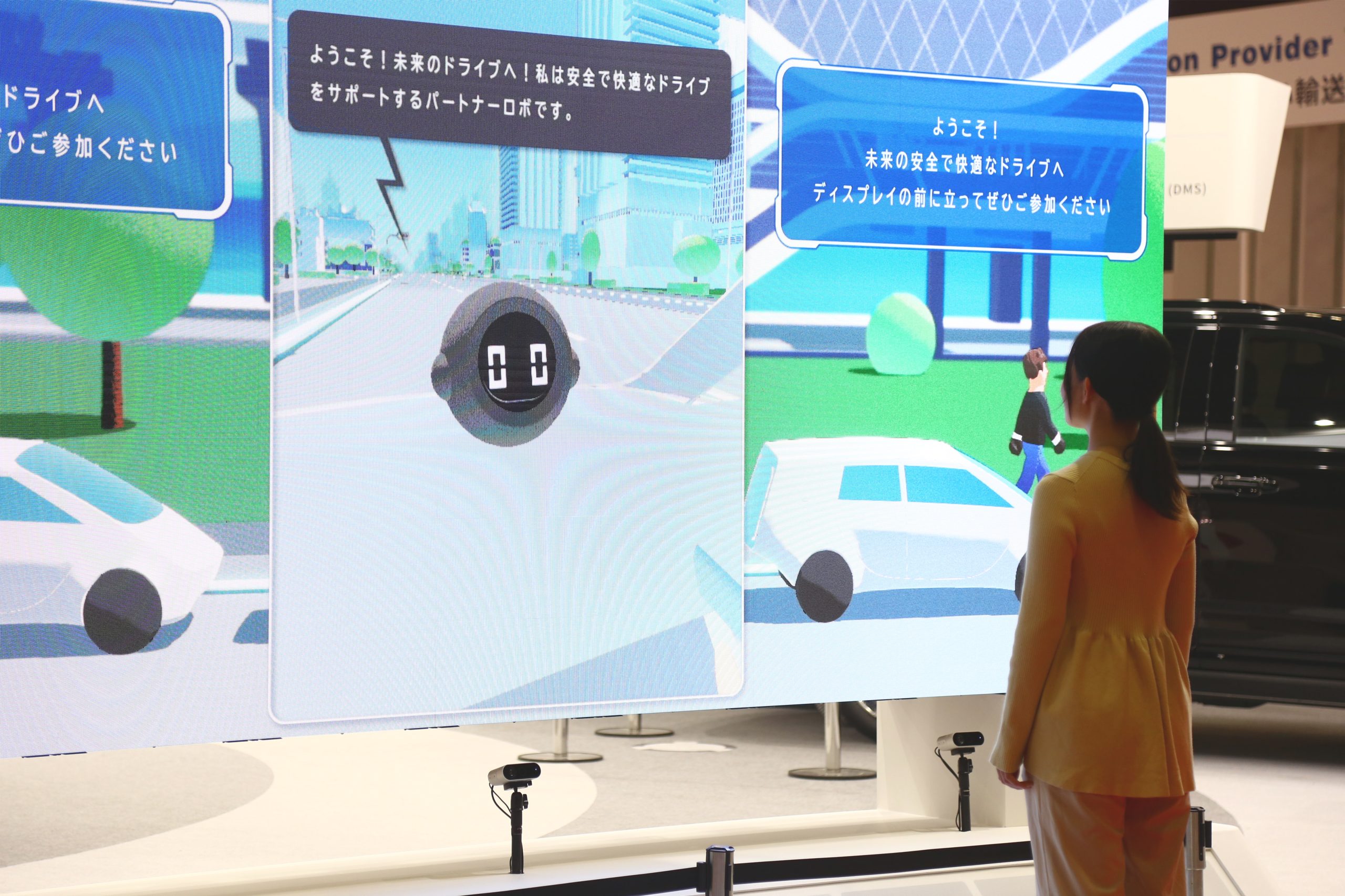 車内カメラを活用し、ドライバーの視線・姿勢・脈拍などから、わき見運転や居眠り、体調異常を検知する「ドライバーモニタリングシステム(DMS)」。本コンテンツでは、DMSの技術を活用した“パートナーロボ”がドライバーに寄り添い、運転状況や体調を見守りながらアドバイスや対話を行う様子を表現しました。より安心・安全で快適なドライブ体験が実現される未来を、体験者自身がアバターを通して直感的に感じられる内容としています。