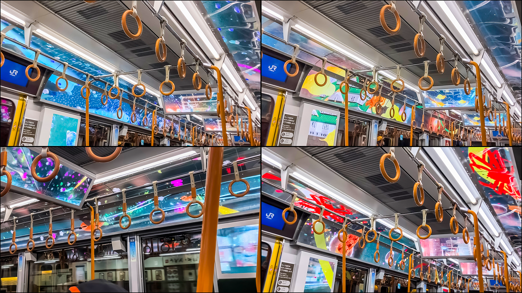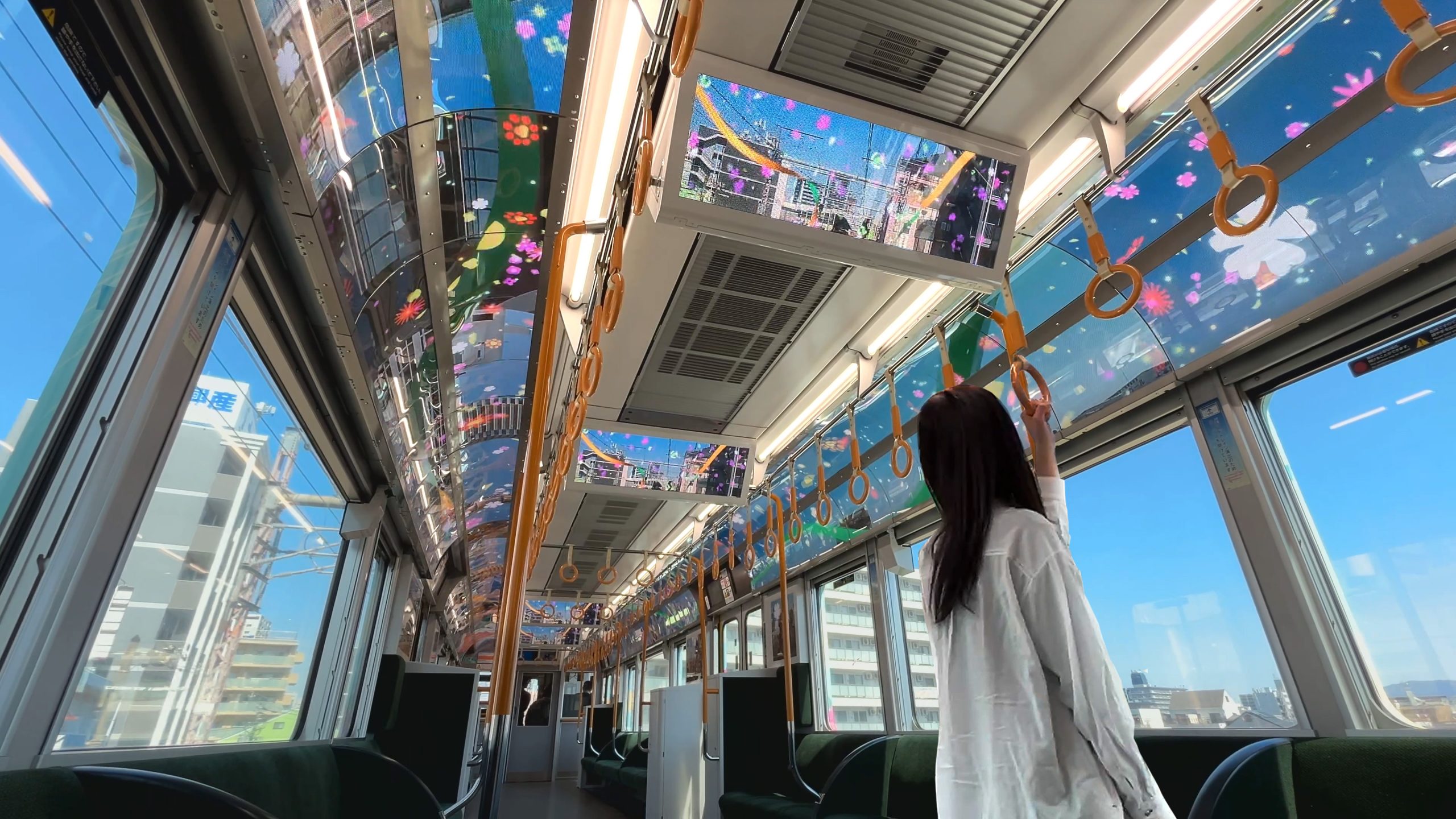 車両内に設置されたLEDモニターには、車窓からのライブ映像と位置情報に連動したAR演出が映し出されます。