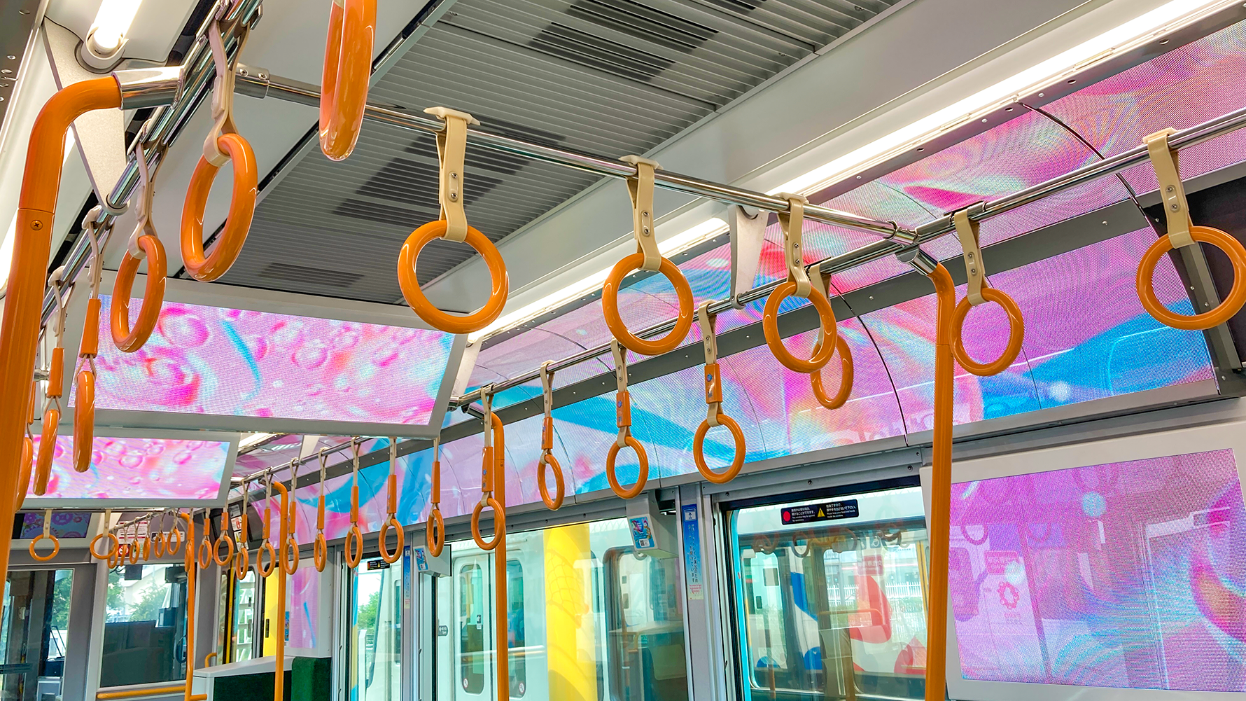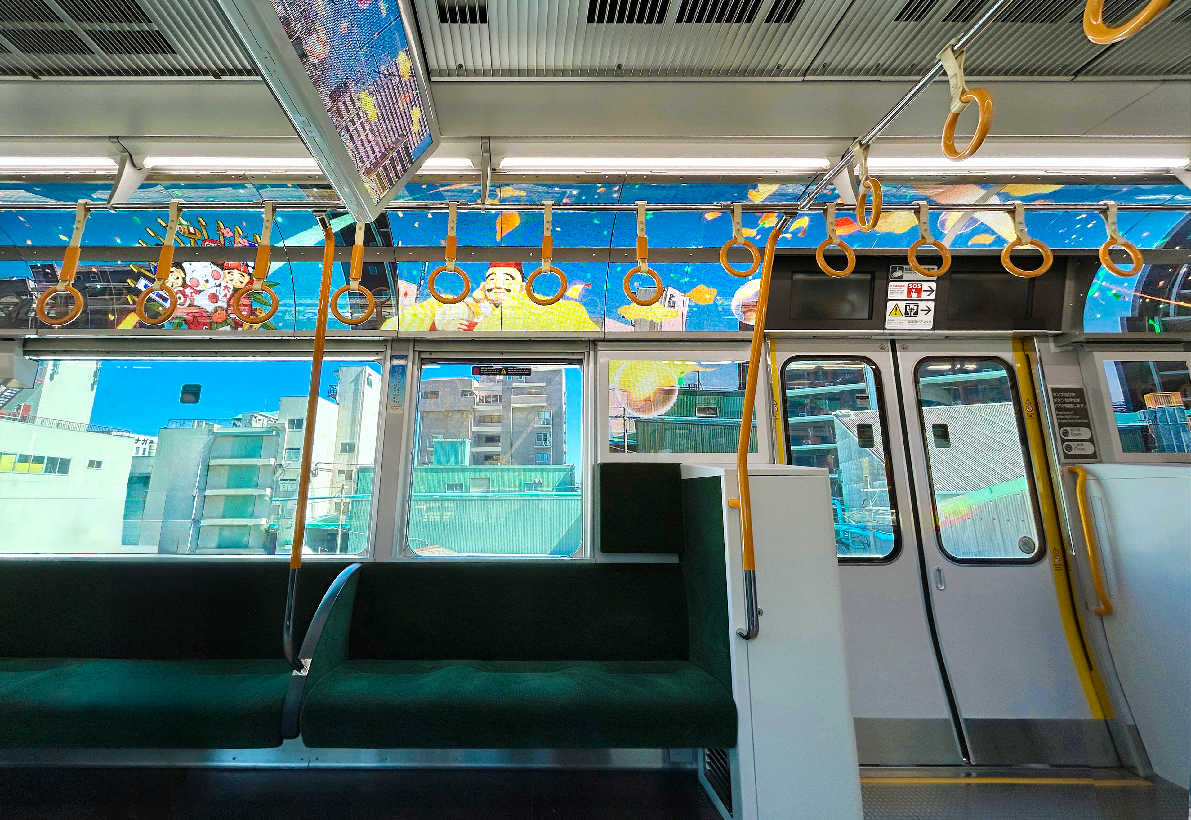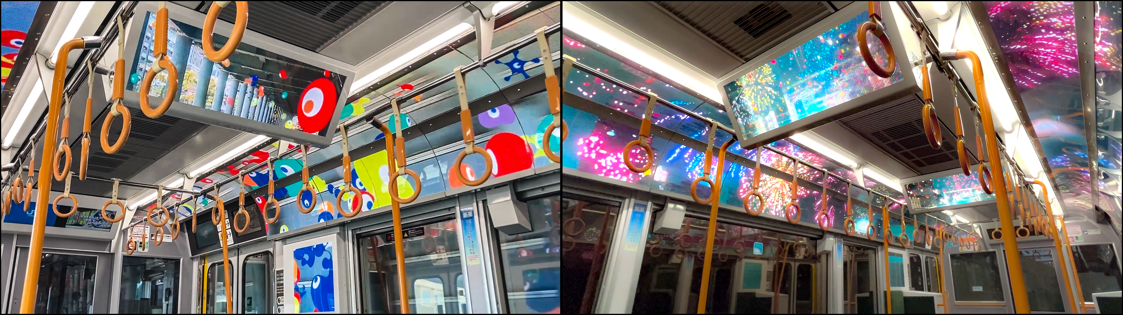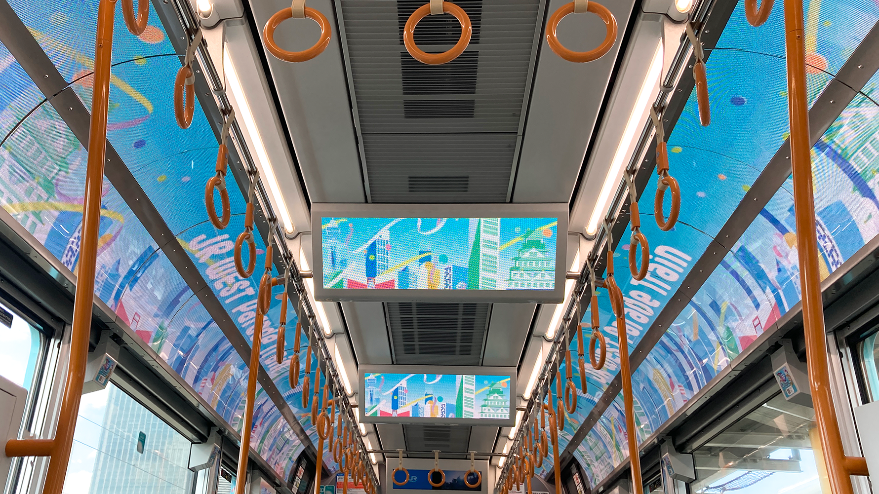列車が駅に入ると、祝祭感あふれる大阪の街が車両内を彩ります。